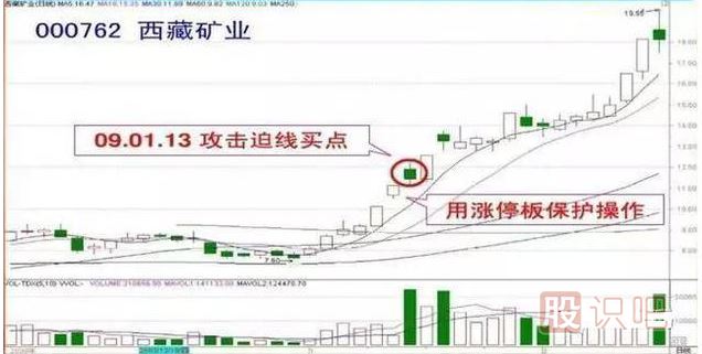 板塊龍頭快速上升過(guò)程中,大幅高開(kāi)(或漲停開(kāi)盤(pán)),當天放量收“假陰線(xiàn)”,稱(chēng)為攻擊迫線(xiàn),短線(xiàn)高手在收盤(pán)前形態(tài)確立后,低吸布局,必有厚報。