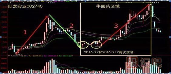 抓不到第一波沒(méi)關(guān)系,這種牛股,大多數人都抓不到第一波,但是我們可以比較容易的抓到第二波或者第三波。圖中2的位置,就是這個(gè)股票大幅上漲之后的一個(gè)深度調整,經(jīng)過(guò)幾個(gè)月的時(shí)間后,這個(gè)股票又來(lái)了第二波上漲行情,而且這第二波不必第一波小。那么在2和3之間就出現了一個(gè)?;仡^的機會(huì )。就是圖中,兩個(gè)黃色圓圈發(fā)出信號的地方,這就是?;仡^。