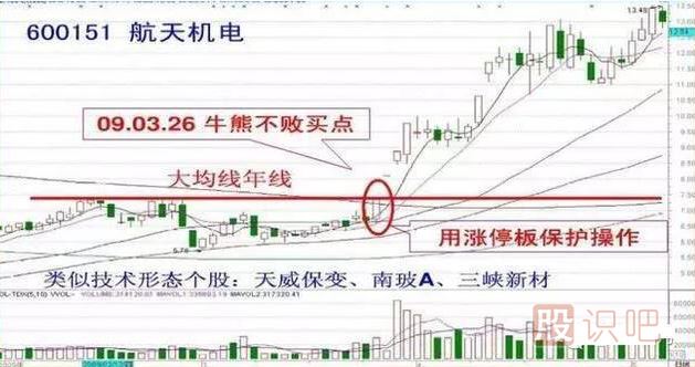 個(gè)股放量漲停沖擊大均線(xiàn)年線(xiàn),構成短線(xiàn)追漲買(mǎi)點(diǎn),短線(xiàn)高手可在漲停直接追漲,是必勝的K線(xiàn)形態(tài),稱(chēng)之為“牛熊不敗”。